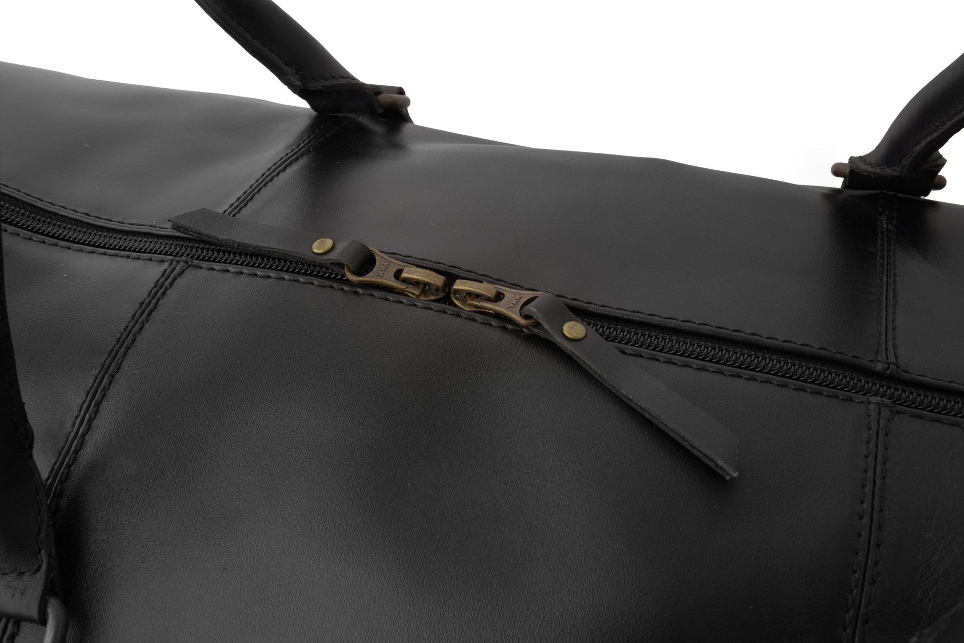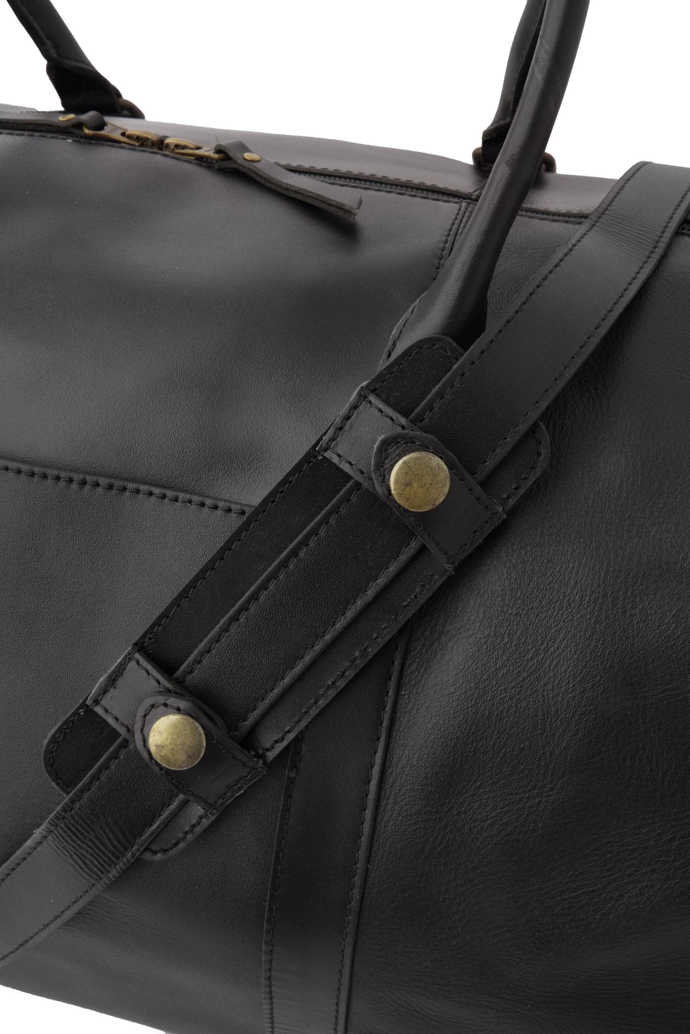 To stylishly secure your belongings, this black leather duffle has a large zippered main compartment and a dedicated slot for a pair of shoes. Two small external zippers are present for storing receipts, train tickets, and change. A removable and adjustable leather shoulder strap with a shoulder pad makes this bag comfortable and convenient to carry.