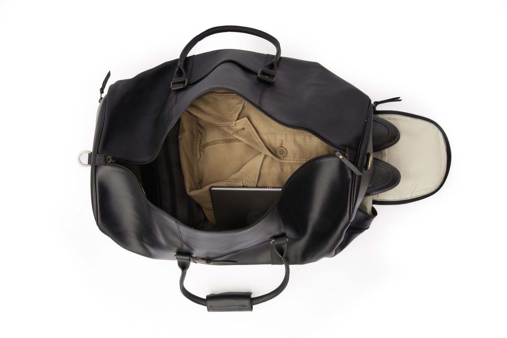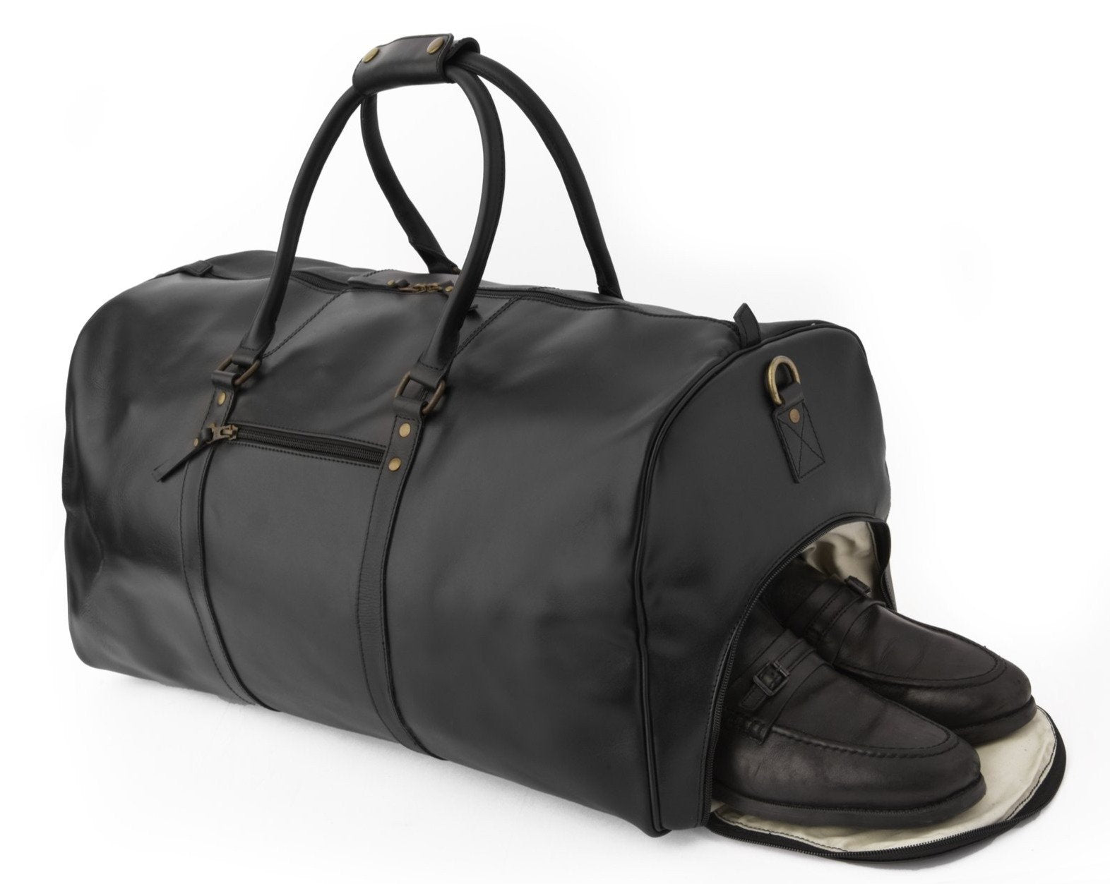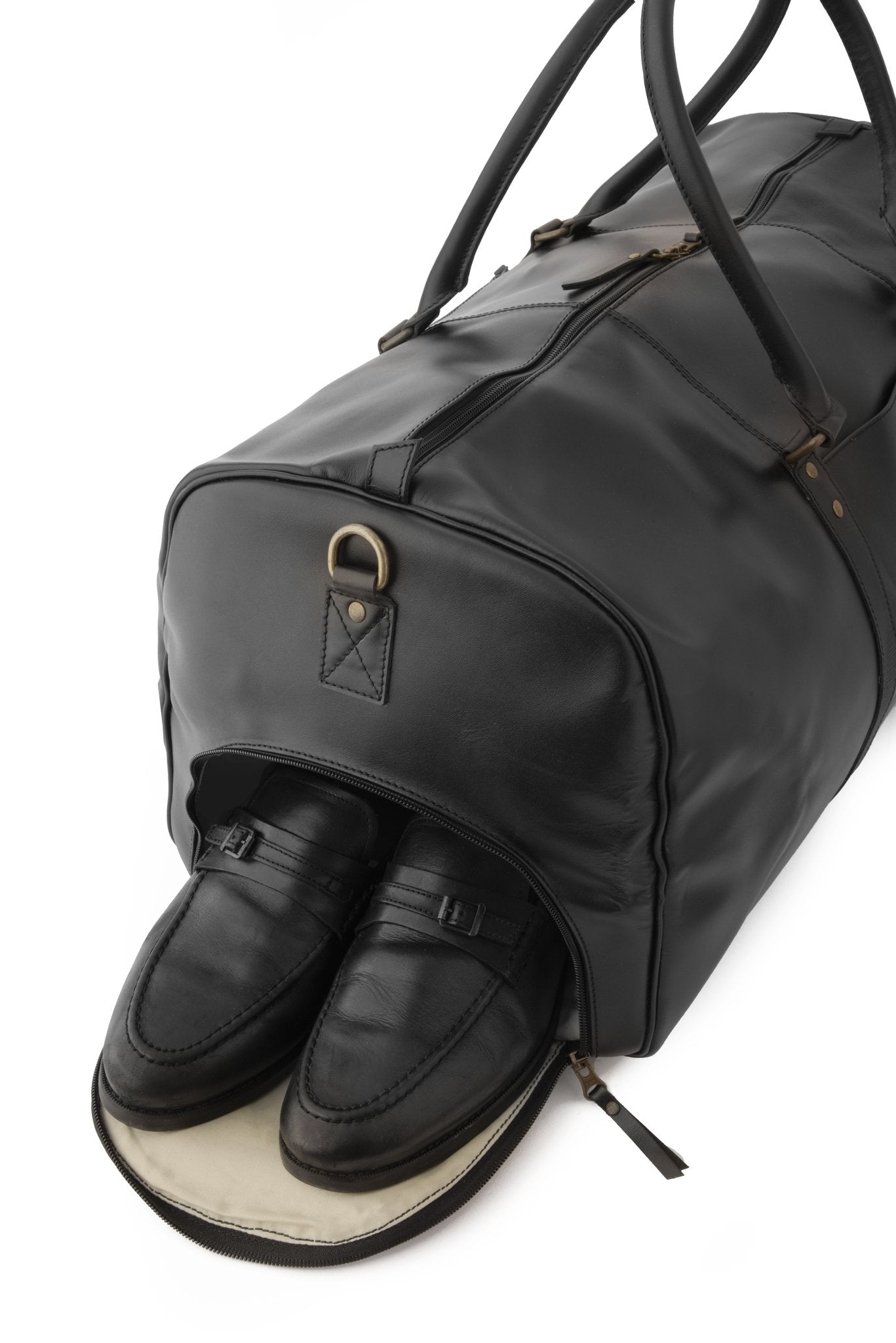 Meet the classic go-to bag you can take almost anywhere. The Ajax Leather Duffle Bag with Shoe Compartment ticks all the boxes. It's spacious, stylish, soft yet strong. Offered in a timeless black finish, this bag will complement any outfit and work well in any setting.