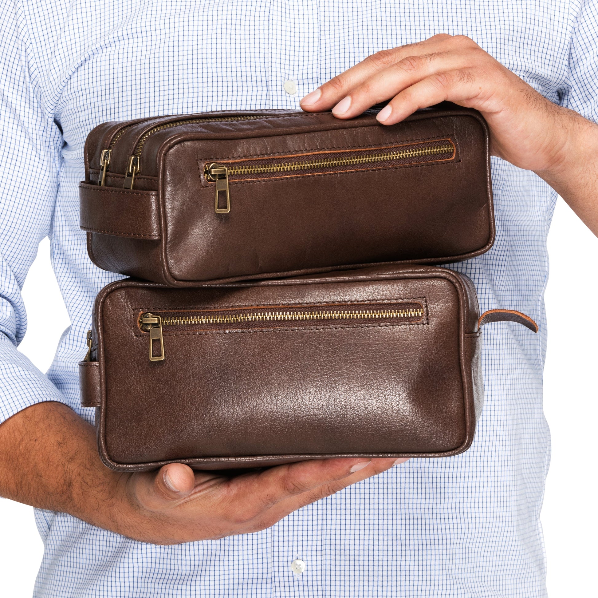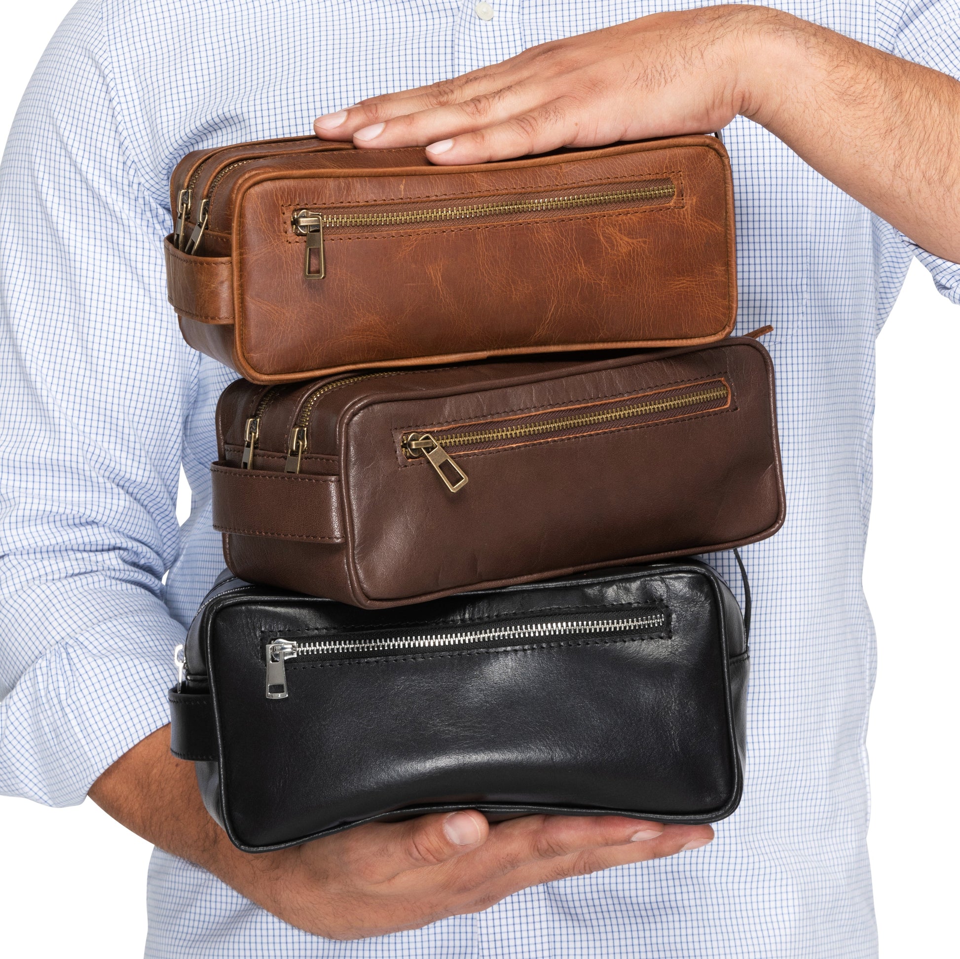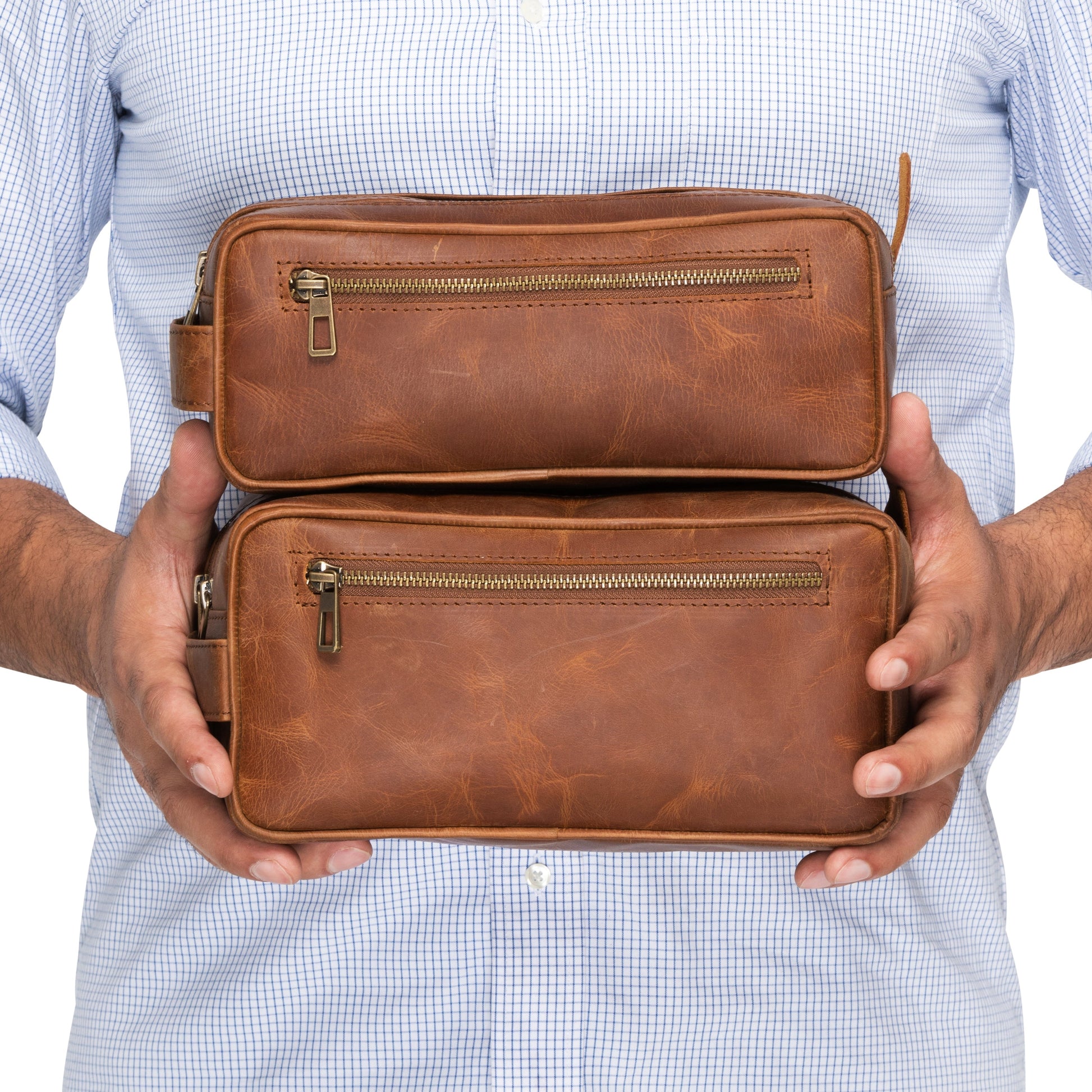 Our Leather Dopp Kits belong to our premium full-grain product line for men who are looking for something unique and different. These Toiletry Bags for men are handcrafted to perfection and designed with dual opening allowing plenty of room for toiletries. In order to produce these bags with extreme durability, we have utilized high quality Full Grain Vegetable Tanned Leather.