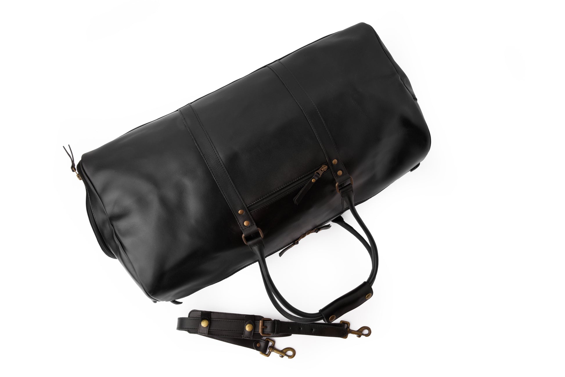 To stylishly secure your belongings, this black leather duffle has a large zippered main compartment and a dedicated slot for a pair of shoes. Two small external zippers are present for storing receipts, train tickets, and change. A removable and adjustable leather shoulder strap with a shoulder pad makes this bag comfortable and convenient to carry.