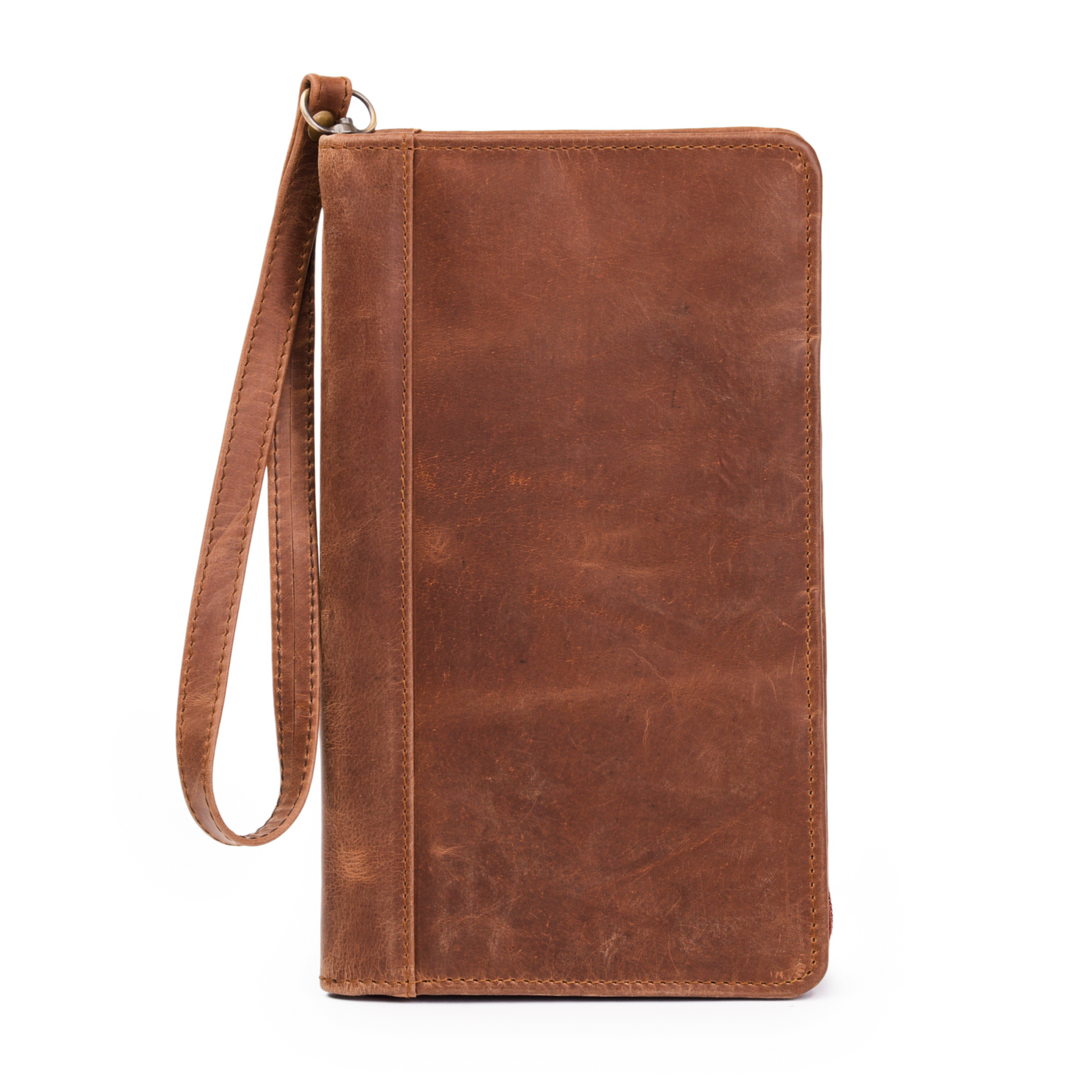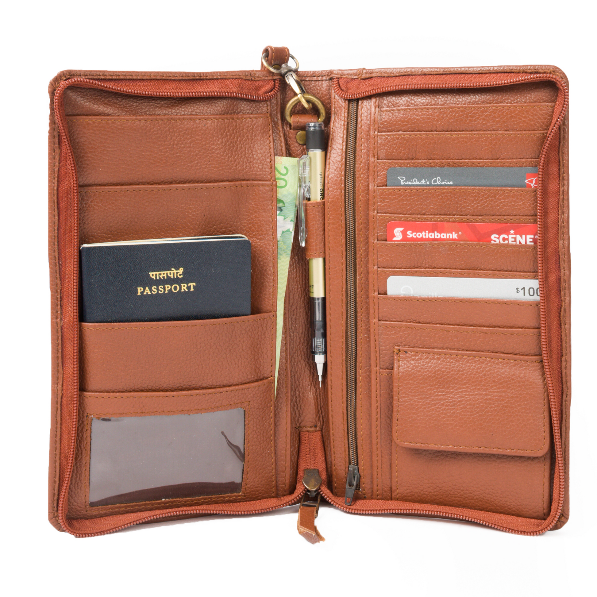This wallet features plenty of room for your travel essentials. It can hold at least 10 cards and has four slip compartments for receipts and cash in different currencies. There is a designated sleeve for your passport to keep it damage-free. An expandable change pocket is also present so you don't need to carry a separate coin purse. Conveniently carry this travel wallet through its removable wristlet leather strap.