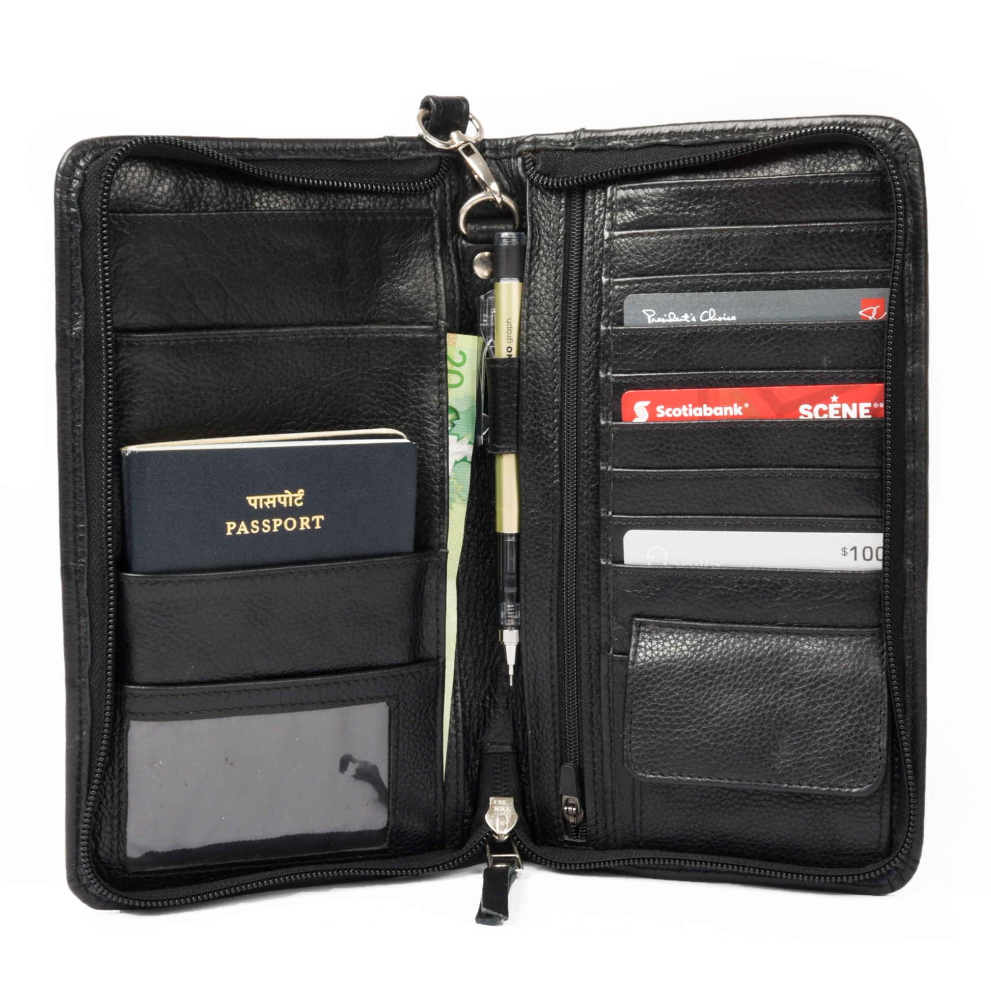 Keep your valuables in one place with Bucks Leather's Zip-Around Leather Passport Wallet. Spacious enough to hold your cash, credit cards, identification cards, pen, passport, and boarding pass, this large wallet will be a useful companion when traveling.